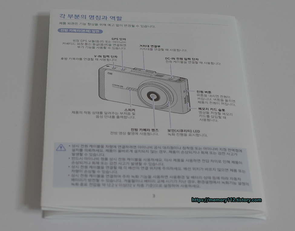 블랙박스 앞면 각 부분의 명칭과 역할은 위 사진을 참고하자.