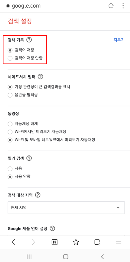 검색 설정을 들어가면 '검색어 저장 안함'이 보이지 않습니다.