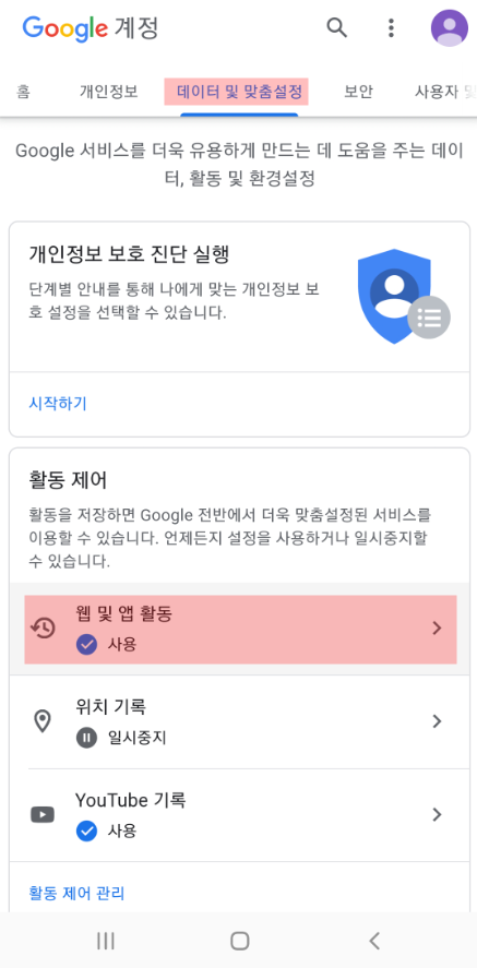 활동 제어에 있는 '웹 및 앱 활동'을 눌러줍니다.