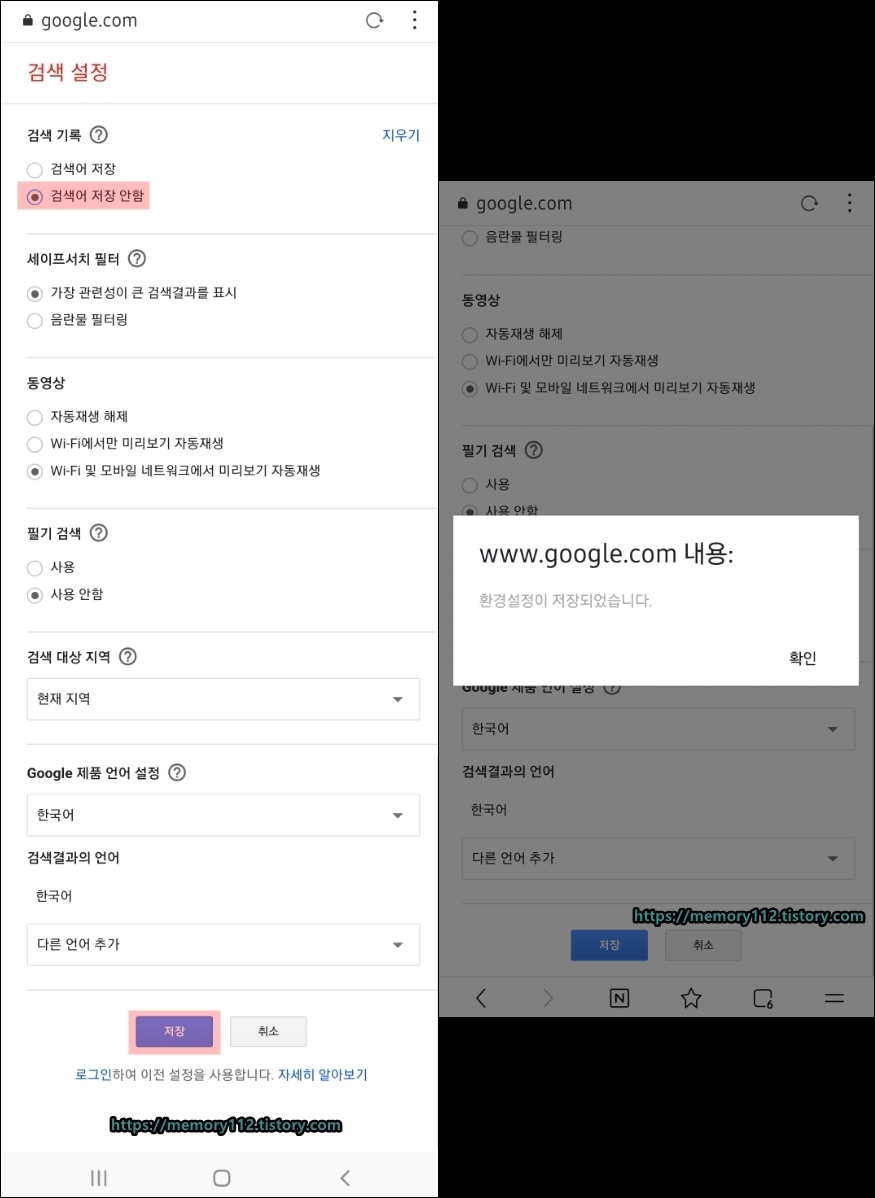 해당 설정을 '검색어 저장 안함'으로 바꿔줘야 합니다.