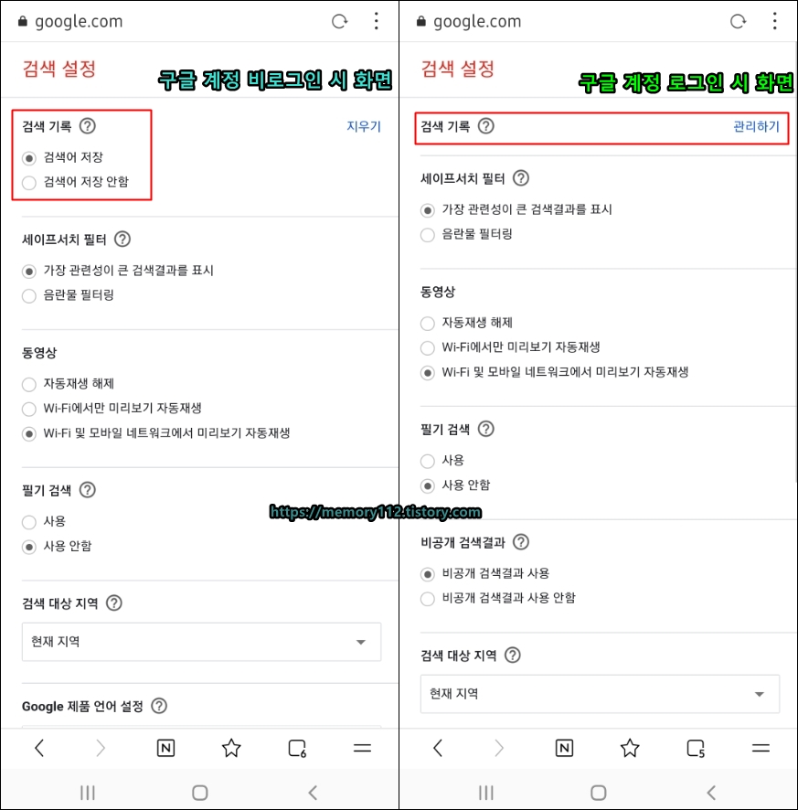 구글 검색 기록 저장 기능을 꺼줘야 합니다.