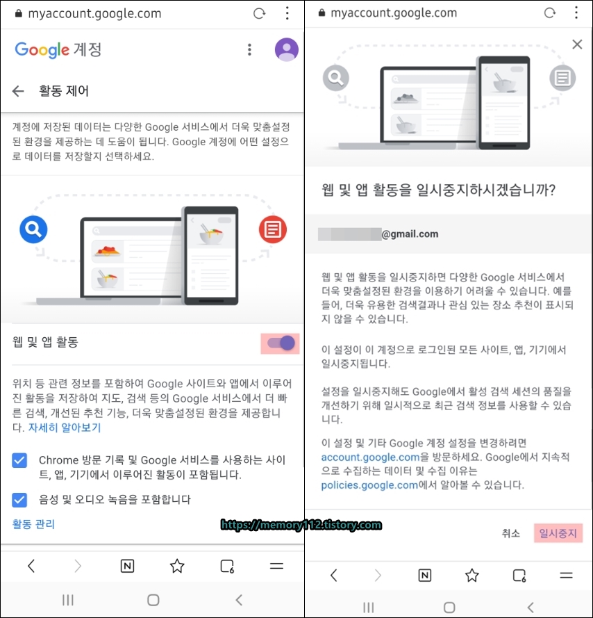 웹 및 앱 활동 기능을 일시중지 해줍니다.