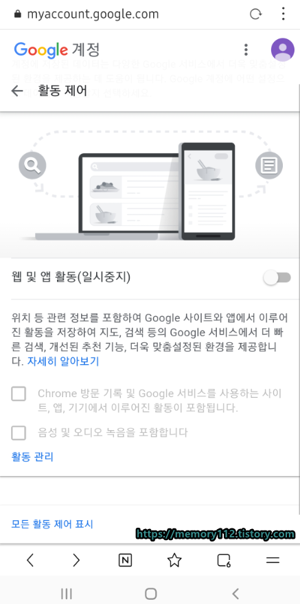 구글 계정 활동 제어 창에서