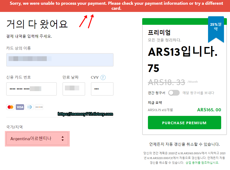 국가가 아르헨티나인 것을 확인하고 해외 결제가 가능한 카드 정보를 입력했다. 결제하기 버튼(PURCHASE PREMIUM)을 누르니 빨간색 안내문이 떴다. 안내문의 내용은 요금 결제에 실패했으니 결제 정보에 오타가 없는지 확인하거나 다른 카드 정보를 입력하라는 것이었다. 그래서 나는 결제 정보에 오타가 없는지 확인도 해보고, 해외 결제가 가능한 다른 카드로도 결제 요청을 해봤는데. 이상하게도 결제가 진행되지 않았다.