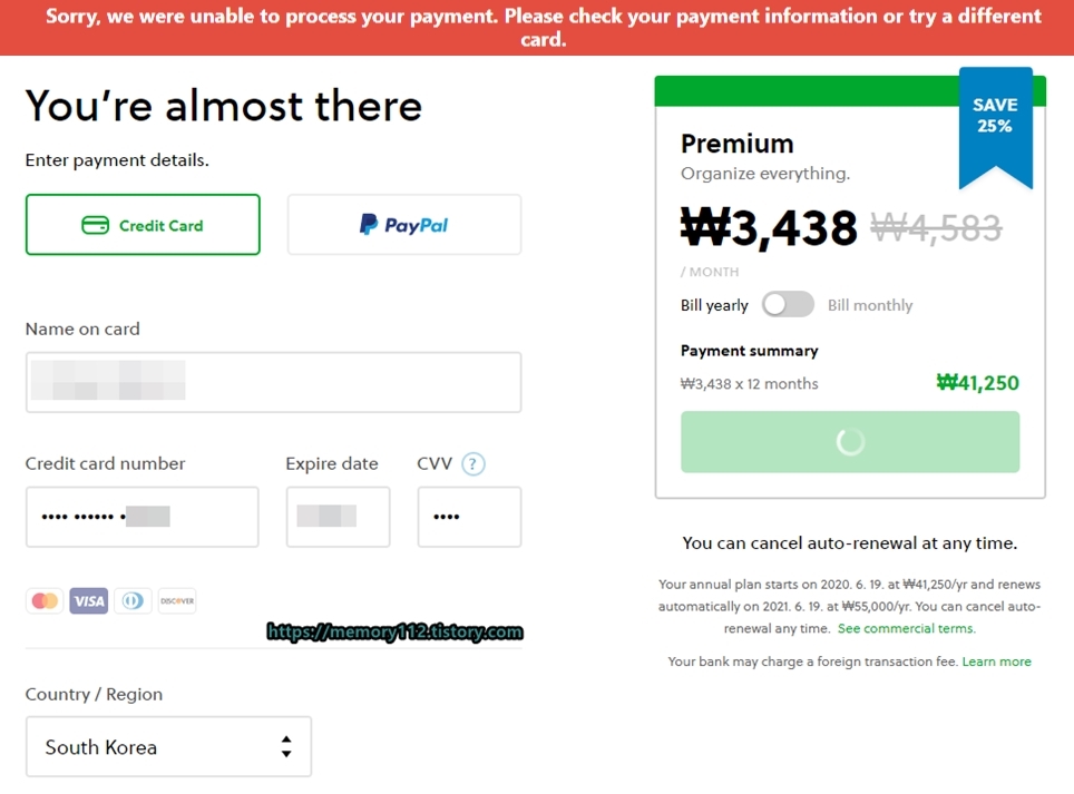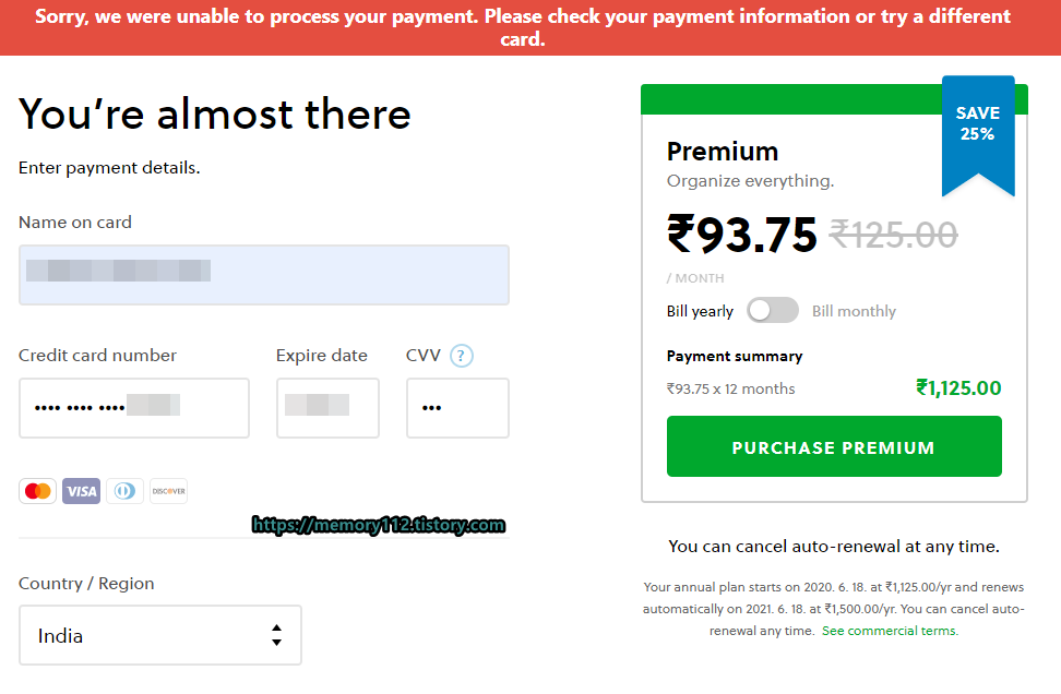 여러모로 불편한 베이직 등급을 계속해서 사용할 수 없었던 나는 결국 한국 돈으로 에버노트 프리미엄 등급을 결제하기로 했다. 이 글을 보시는 여러분들은 요금이 그렇게 비싸지도 않은데 왜 이렇게 유난스럽냐고 생각할지도 모르겠다. 에버노트의 편의성을 생각하면 월 6천원의 요금이 기꺼이 낼 수 있다. 다만 이전에 결제했던 3천원(1년 비용)도 안 되는 금액이 눈에 아른거려서 그럴 뿐이다.