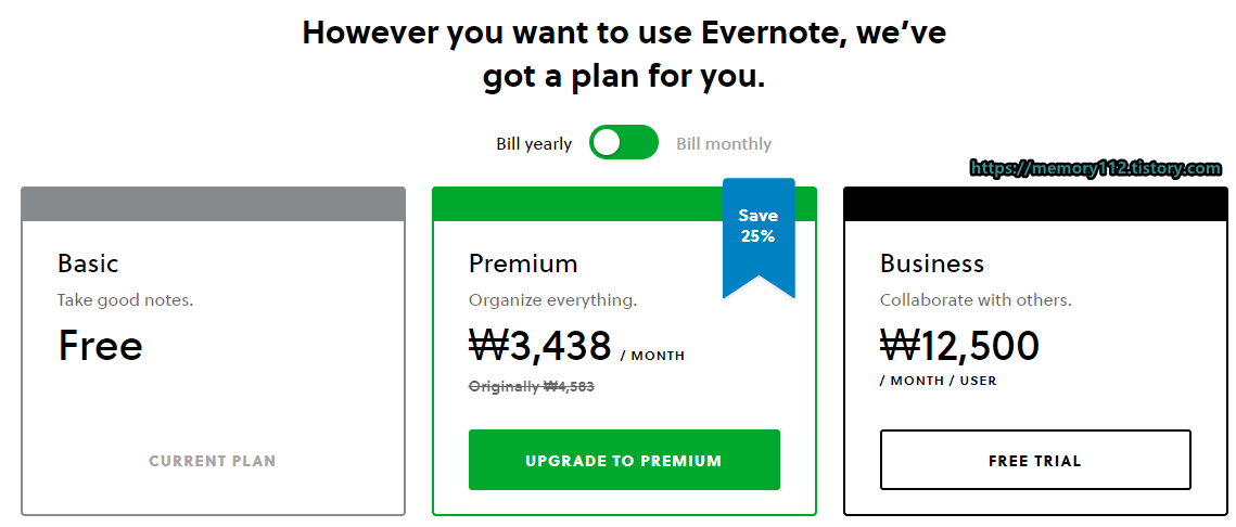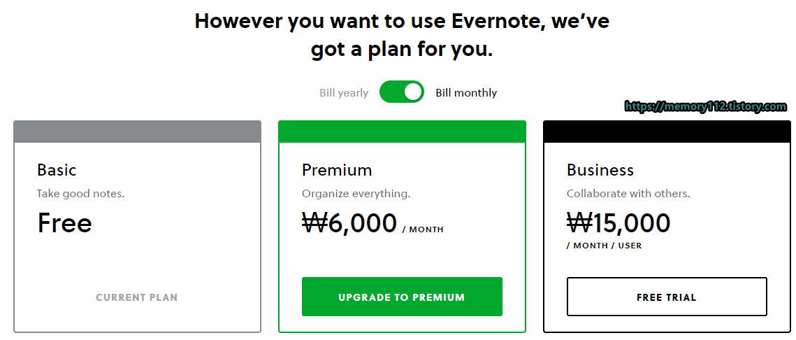 에버노트는 사용자 등급이 3가지로 나눠져 있다. 먼저 무료인 '베이직'과 매월 6,000원을 지불해야 하는 '프리미엄' 그리고 매월 15,000원을 지불해야 하는 '비즈니스' 이렇게 3가지로 구분되어있다.