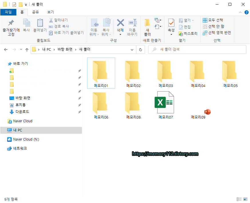 '(중요)'라고 적은 부분을 무시하고 파일명 변경을 진행하면 내 생각과는 다르게 파일명이 변경될 수 있습니다. 정확히는 파일명 변경 적용 순서가 이상해진다는 것이죠. 원래는 맨 좌측에 있는 폴더가 '메모리'로 변경되었어야 맞는 건데 이상하게도 그것은 '메모리 (5)'로 설정되었습니다. 이렇게 된 이유는 파일 및 폴더를 드래그한 후, 마우스 커서를 두 번째 폴더에 두고 우클릭을 눌러 이름을 바꿨기 때문입니다. (위 사진 참고)
