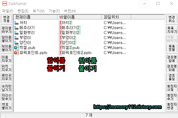 참고로 앞이름 붙이기와 뒷이름 붙이기는 이러한 기능을 합니다.