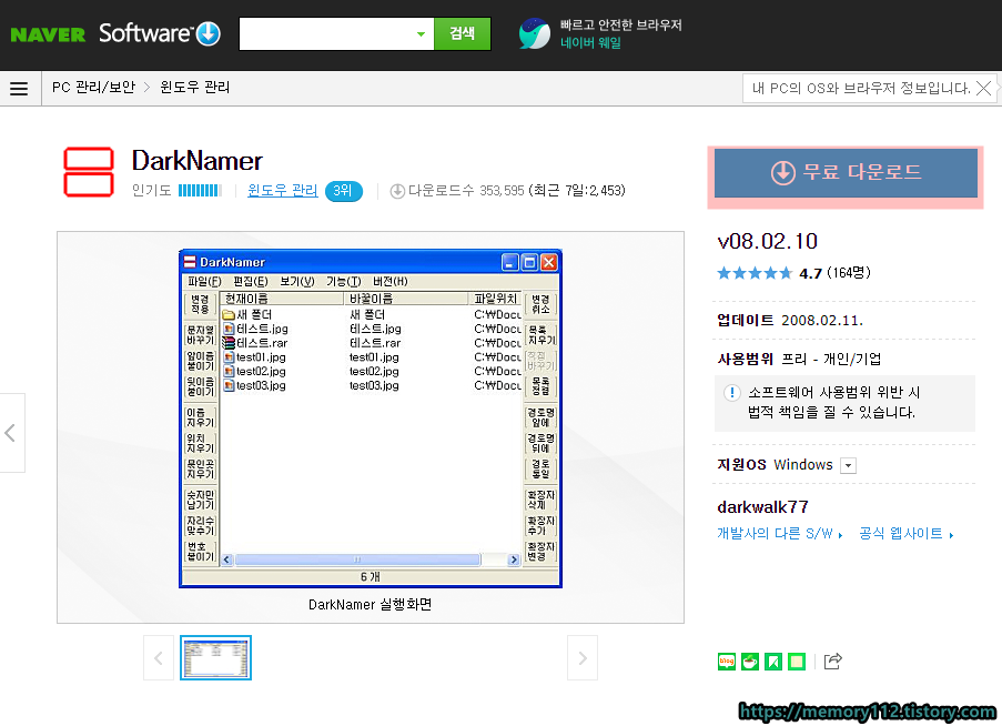 '무료 다운로드' 버튼을 눌러줍니다. 참고로 다크네이머는 무설치 프로그램입니다.