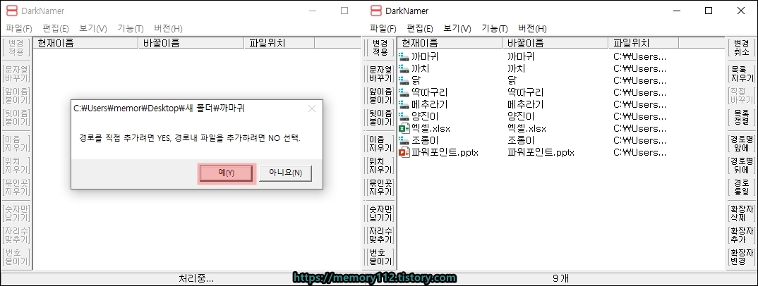 경로를 찾아 파일을 추가하는 것이 귀찮다면 그냥 파일들을 다크네이머 목록에 드래그 앤 드롭하면 됩니다.