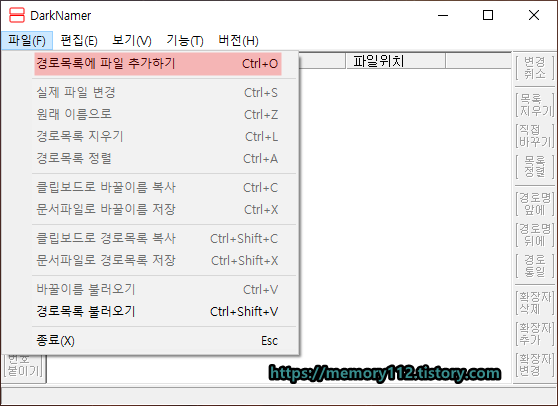 파일 메뉴에 있는 '경로목록에 파일 추가하기' 버튼을 눌러서 이름을 바꾸고 싶은 파일을 추가해줍니다.