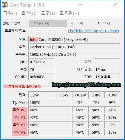 삼성의 인텔 CPU를 사용하는 저의 노트북으로 해당 프로그램을 실행시켜보니 이렇게 코어별로 온도를 확인할 수 있었습니다. 4코어 CPU라서 코어 #0부터 #3까지 있는 것이죠.