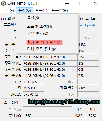 CPU 온도를 예의 주시해야 하는 상황이라면 항상 맨 위에 표시(A) 옵션을 사용해 온도를 계속 모니터링하세요.