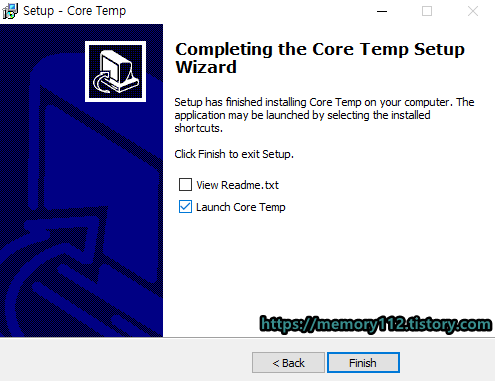 설치가 완료되었습니다. 참고로 'Launch Core Temp'를 체크하고 완료 버튼을 누르면 설치 완료와 함께 해당 프로그램이 실행됩니다.