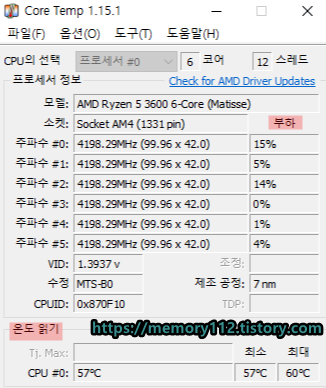 온도 읽기 부분에는 원래 각 코어의 온도가 나와야 하는데. 저는 'CPU #0'밖에 안보입니다. 그 이유는 AMD의 온도 센서가 1개이기 때문입니다.