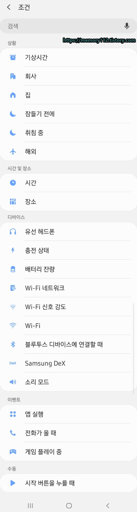 선택 가능한 조건은 상황(기상시간, 회사, 집 등), 시간 및 장소, 디바이스(유선 헤드폰, 블루투스 기기 연결, 충전 상태 등), 이벤트(앱 실행, 전화가 올 때 등), 수동(시작 버튼을 누를 때)이 있다.