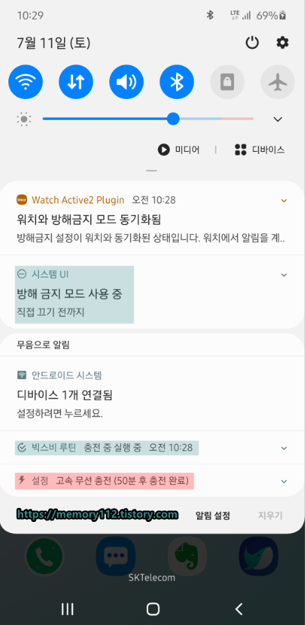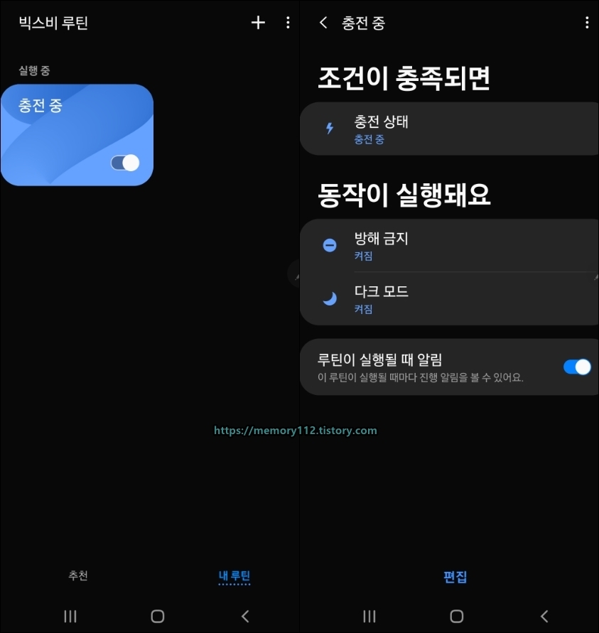 내가 설정한 루틴 실행 조건은 충전 중이었는데. 충전기와 연결해 휴대폰을 충전 중 상태로 만드니 바로 루틴이 실행되었다. 참고로 루틴 첫 번째 동작은 방해 금지 모드였다.