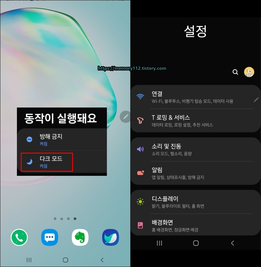 루틴 두 번째 동작은 다크 모드 켜짐이었는데. 다크 모드도 이상 없이 잘 실행되었다.