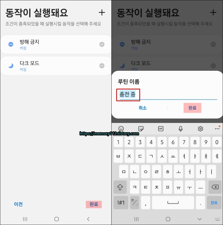 동작까지 모두 설정해주었다면, 우측 하단에 있는 완료 버튼을 눌러 루틴 이름을 지정해주자.