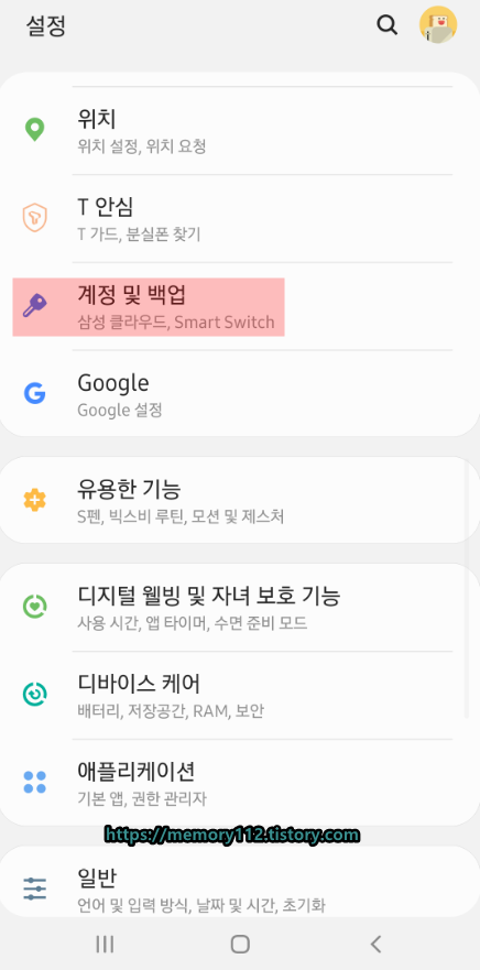 설정 메뉴에 들어온 후, '계정 및 백업'을 눌러준다.