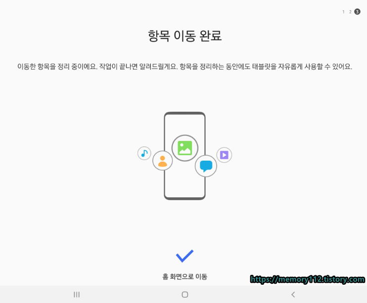 조금 기다리니 데이터 이동이 완료되었다. 데이터 이동이 완료되면 이동한 항목을 기기가 알아서 정리하는데. 이 작업까지 마치면 데이터 이동은 최종적으로 완료되는 것이다.