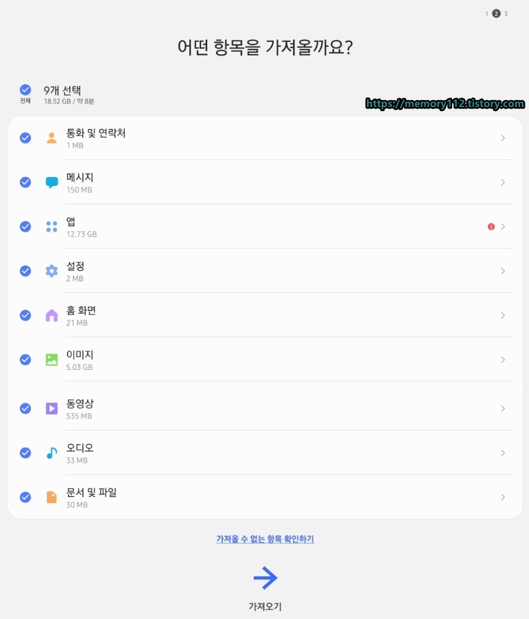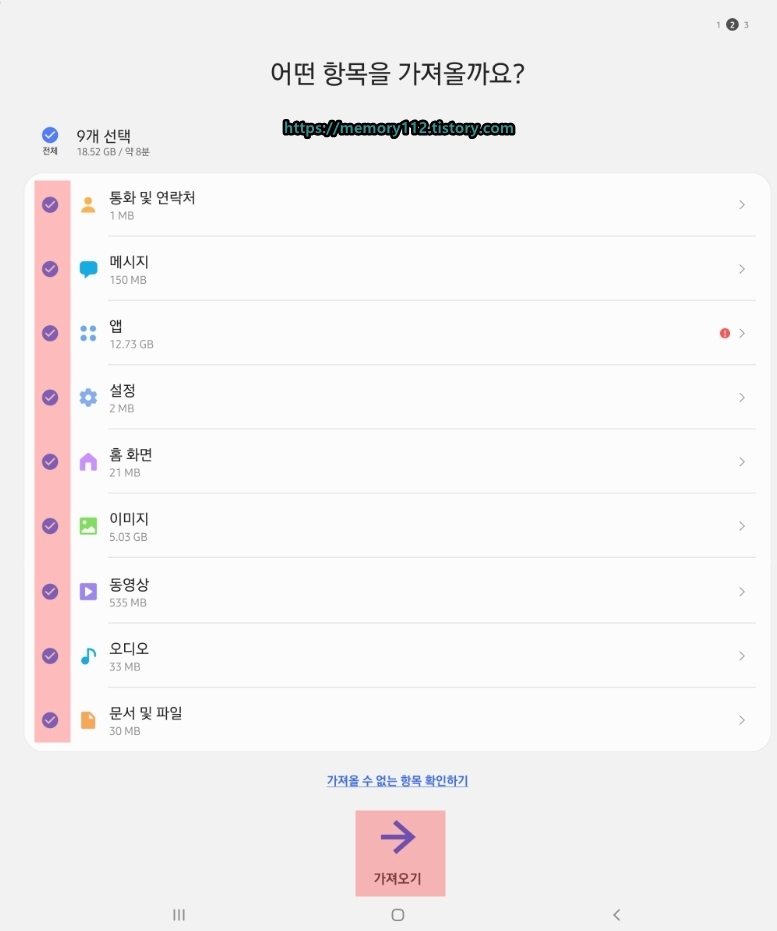 가져올 수 있는 데이터 검색이 끝났다. 이제 갤럭시 탭S6로 가져오고 싶은 데이터를 체크한 후, 아래에 가져오기 버튼을 눌러주자.