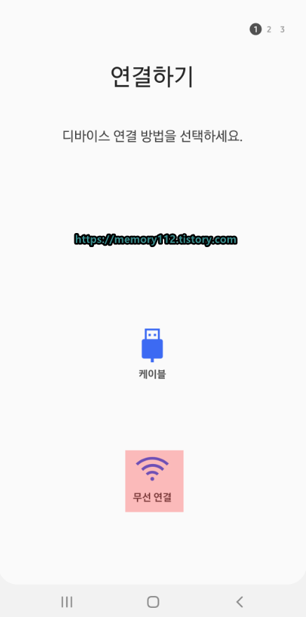 여기서 무선 연결을 눌러준다. 갤럭시 스마트폰끼리는 데이터나 와이파이가 없어도 무선 연결이 가능하기 때문에 굳이 케이블을 이용해 연결할 필요는 없다.