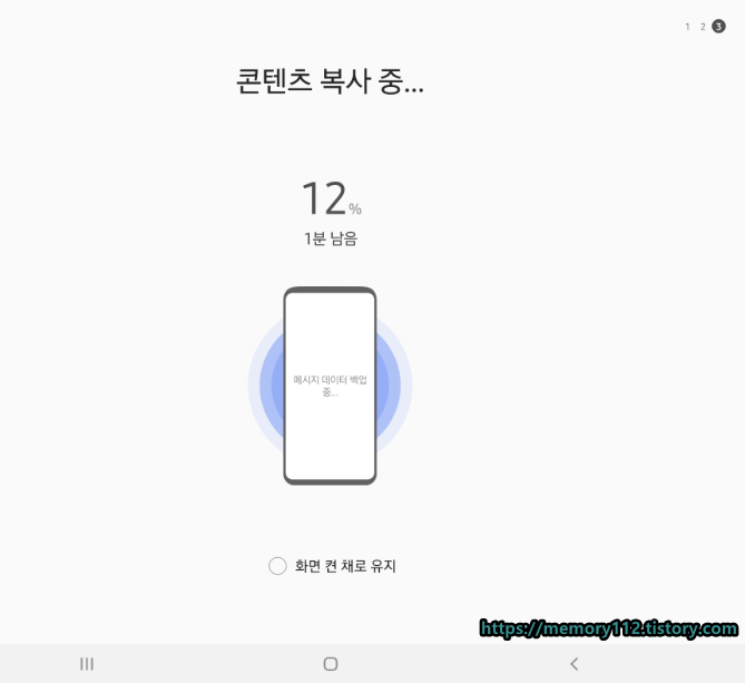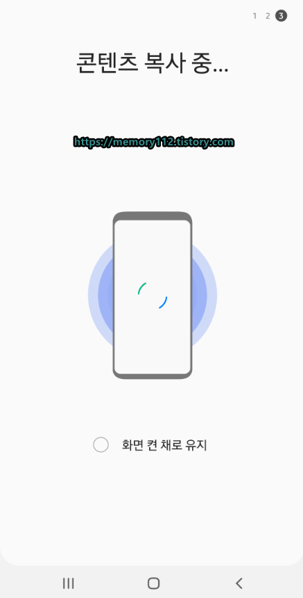 그러면 이렇게 '콘텐츠 복사 중...'이라는 메시지가 뜨면서 기기간 데이터 이동이 시작된다.