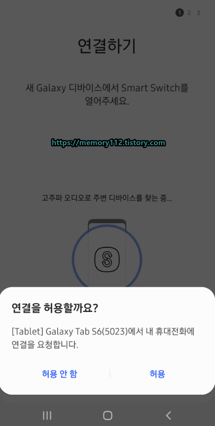 그러면 '고주파 오디오로 주변 디바이스를 찾는 중...'이라는 메시지가 뜰텐데. 이러한 메시지가 떴을 때 갤럭시 탭S6에서도 스마트 스위치를 실행시켜준다.