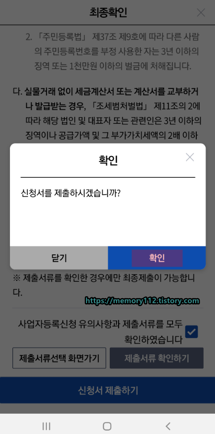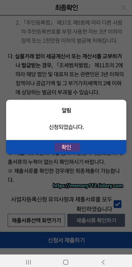 '신청서를 제출하시겠습니까?'라고 뜬다면 확인 버튼을 눌러줍니다.