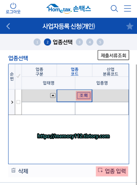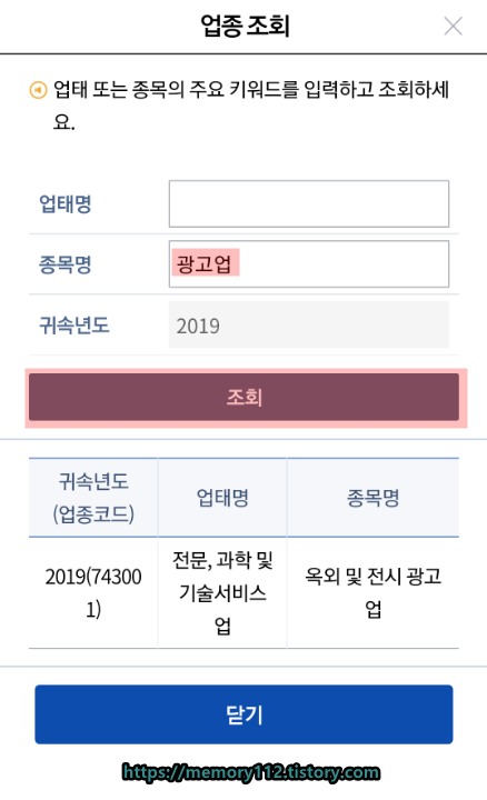 우측 하단에 업종 입력을 누르고, 조회 버튼을 눌러줍니다.