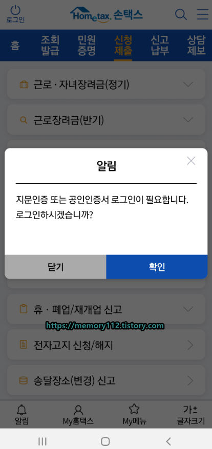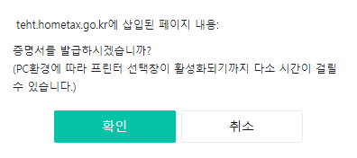 위와 같이 '증명서를 발급하시겠습니까?'라고 뜨면 확인을 눌러줍니다.