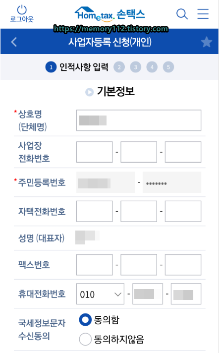 상호명(아무렇게나 입력 가능), 휴대폰 번호 등 여기서 필수로 입력해야 하는 부분들만 입력해줍시다.