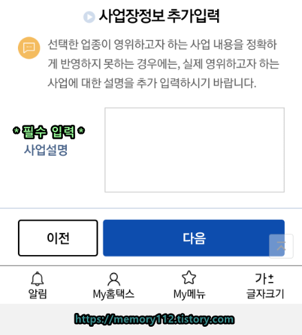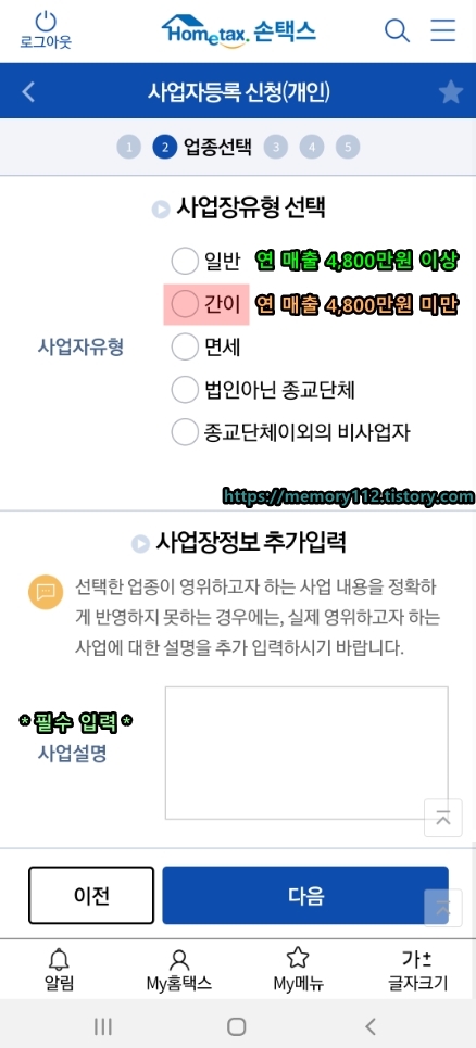 사업설명을 간단히 입력해줍니다. 참고로 저는 개인 블로그에 구글 애드센스 광고를 걸어 수익을 얻는다고 적었어요. 모두 입력했다면 아래에 다음 버튼을 눌러줍니다.