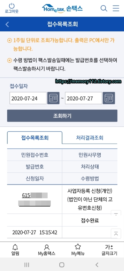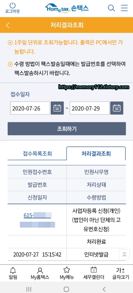 홈택스 앱에서 민원처리결과를 확인해보니 '처리완료'라고 표시되네요. 이제 사업자등록증을 출력해볼까요?