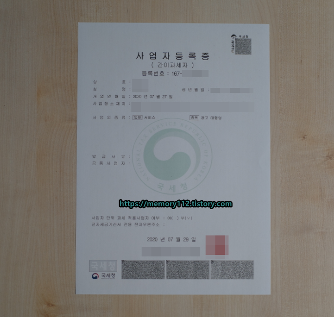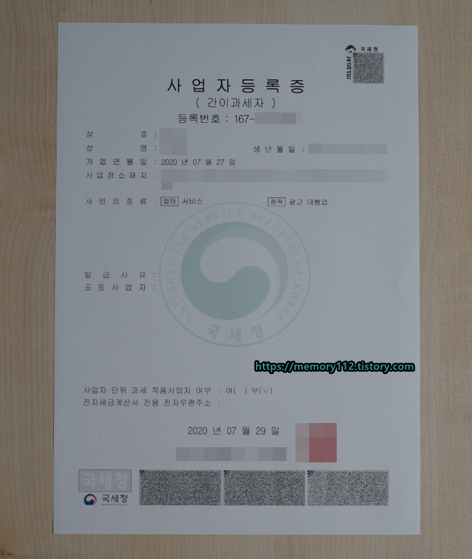 사업자등록증 출력이 완료되었어요. 사업자등록증에 적힌 내용을 확인해보니 업태는 '서비스'이고, 종목은 '광고 대행업'이네요. 나에게 사업자등록증이라니.. 뭔가 신기하네요.!!