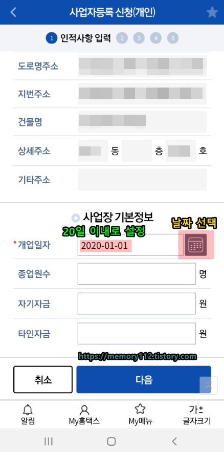 이제 개업일자를 입력해줍니다. 개업일자는 사업개시일 20일 이내로 입력해야 합니다. 저는 개업일자를 20년 01월 01일로 해서 신청했었는데요. 나중에 세무서에서 전화가 와서는 20년 01월 01일로 소급적용은 안된다고 해서 개업일자를 신청 당일(20년 07월 27일)로 변경했어요. 물론 이거 하나 때문에 전화 온 것은 아니었어요. 사업 내용에 대해 간단히 물어보기도 하셨어요.