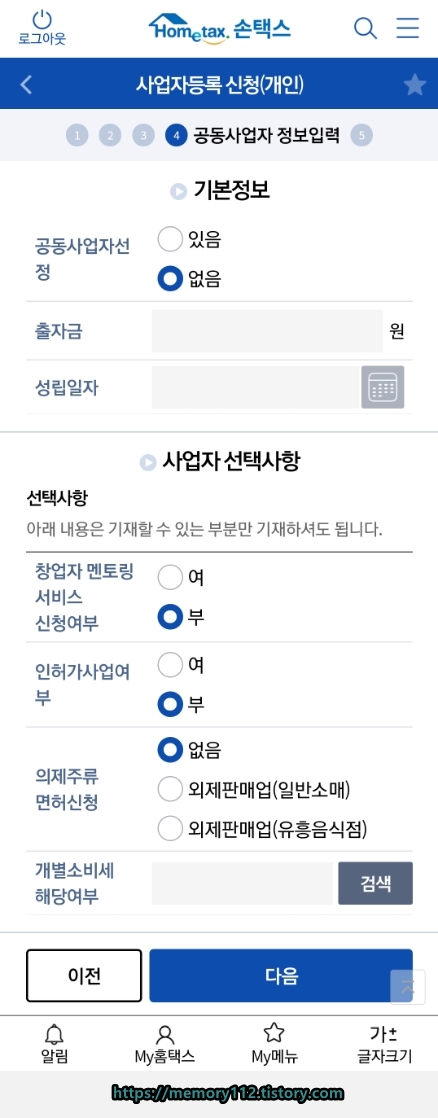 공동 사업자 선정, 선택사항(창업자 멘토링 서비스 등)을 모두 입력하고 아래에 다음 버튼을 눌러줍니다.
