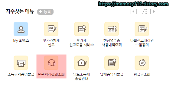 홈택스 홈페이지에 접속한 후, 자주찾는 메뉴에 있는 '민원처리결과조회'를 눌러줍니다.