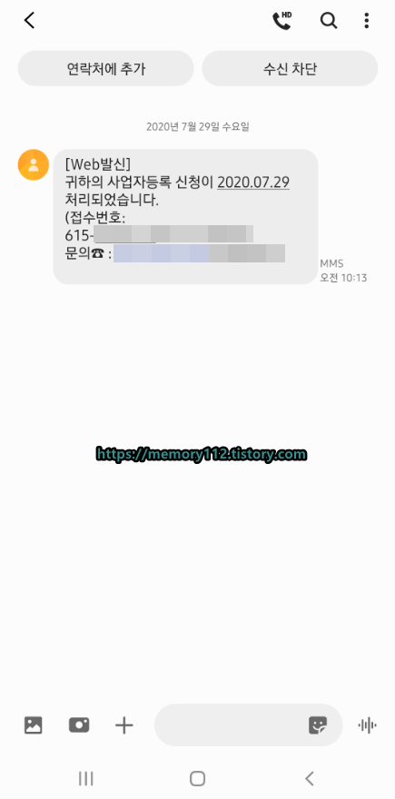 사업자 등록 신청서 제출일로부터 2일이 지난 오전에, 세무서에서 전화가 왔습니다. 사업 내용에 대해서 물어보시더라고요. 저에게 전화하신 분은 구글 애드센스에 대해 잘 모르시더라고요. 그래서 전화로 잘 설명드렸습니다. 복잡하게 설명할 필요는 없어요. 약간 확인차 전화하는 느낌이랄까.. 아무튼 전화를 끊고 조금 기다리니까 '귀하의 사업자등록 신청이 처리되었습니다.'라는 문자가 왔어요. 드디어 사업자 등록 처리가 완료된 거예요.!!