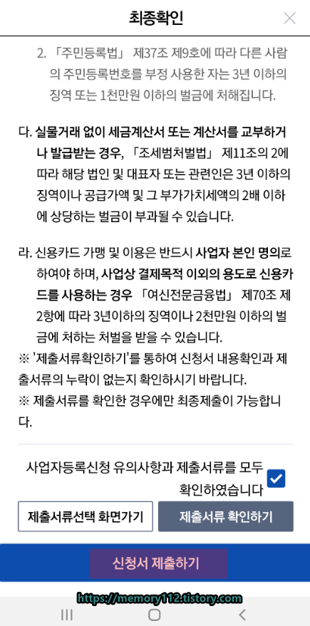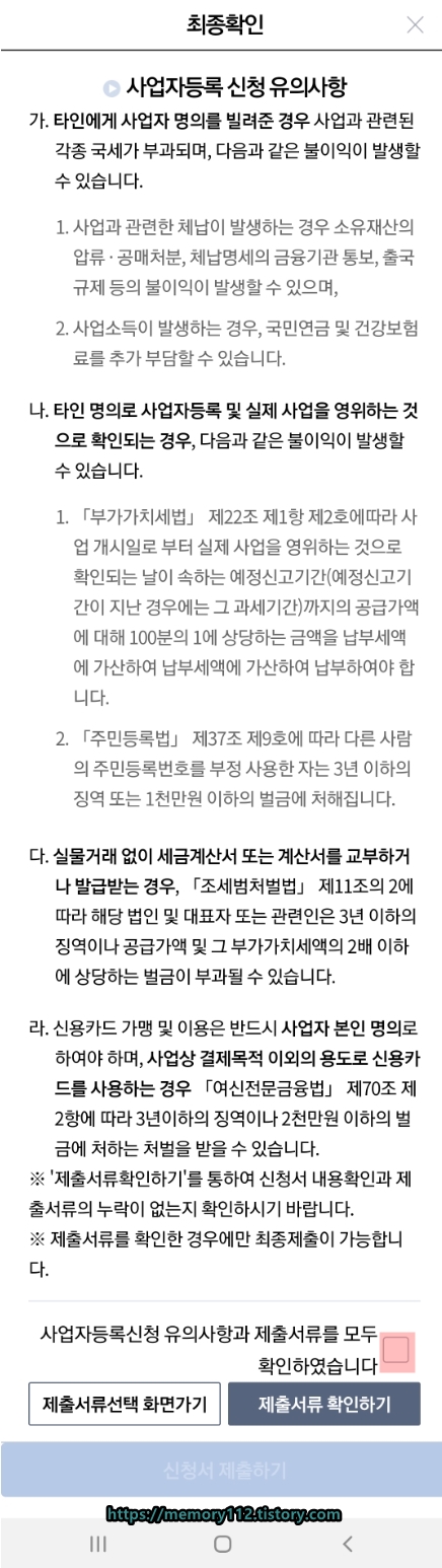 '사업자등록신청 유의사항과 제출서류를 모두 확인하였습니다.'를 체크해줍니다.