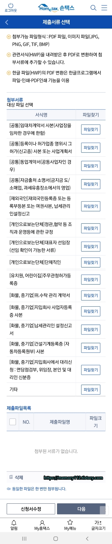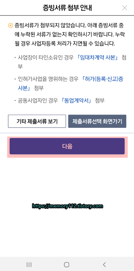 제출해야 할 서류가 있다면 첨부해줍니다. 사업장을 임차했다면 임대차계약서 사본을 첨부해야 하고, 동업사업자라면 동업계약서를 첨부해야 합니다. 일반적은 블로거는 따로 첨부해야 할 서류는 없기 때문에. 첨부 파일 없이 아래에 다음 버튼만 눌러줍니다.