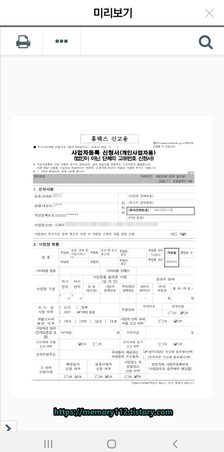 이렇게 신청서 미리보기 창이 뜬다면 틀린 정보는 없는지 확인해줍니다. 신청서 우측을 보니 처리기간은 '2020.7.1. 신청분부터 2일(보정기간은 불산입)'이라고 되어있네요. 사업자 등록 처리는 2일 정도 걸리나 봐요.