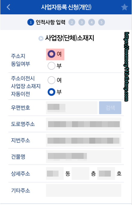 사업자 소재지 주소지 동일여부를 선택해줍니다. 참고로 여는 '그러함'을 뜻하고, 부는 '그렇지 않음'을 뜻합니다. 저는 '여'를 선택했습니다.