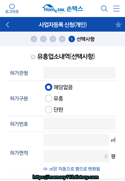 유흥업소 허가구분은 '해당없음'으로 선택해줍니다.