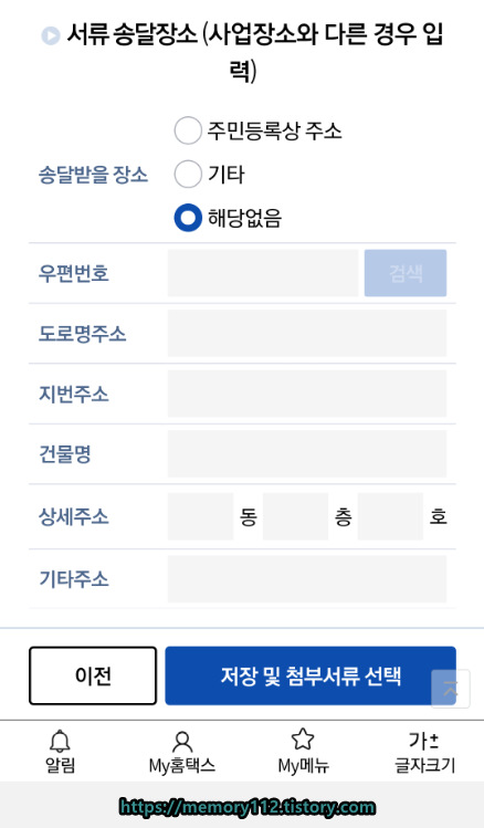 서류 송달장소(주민등록상 주소, 기타, 해당없음)를 선택해줍니다.