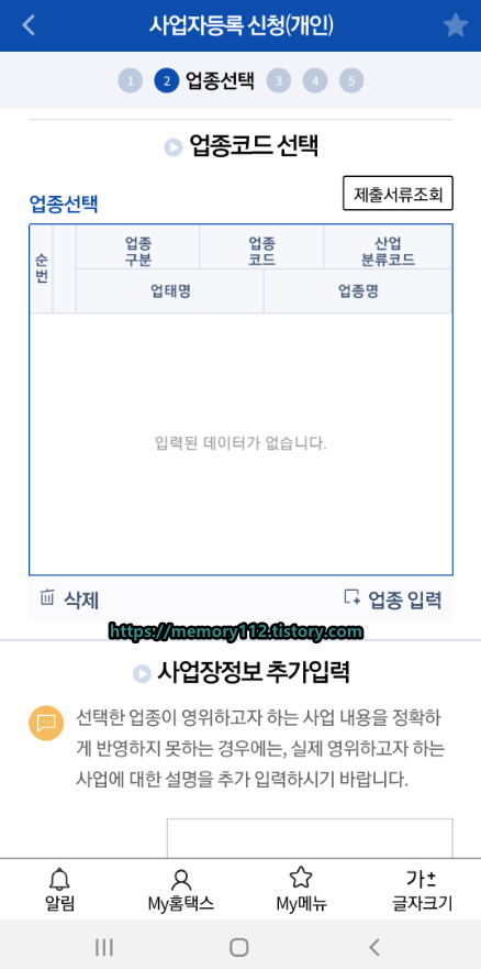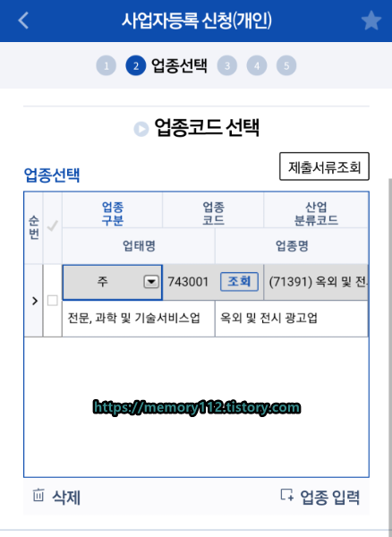그러면 이렇게 목록이 추가됩니다. 업종 구분은 '주(업종)'로 선택해줍니다. '부(업종)'로 선택하니 다음 단계로 못 넘어가더라고요. 주업종 하나는 필수로 있어야 하나 봅니다.