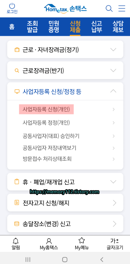 홈택스 앱을 실행시킨 후, 신청제출 메뉴에 있는 '사업자등록 신청(개인)'을 눌러줍니다.