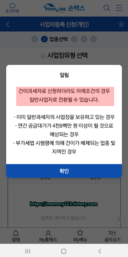 '간이'를 선택하니 이러한 알림이 뜨네요. 이미 일반과세자의 사업장을 보유하고 있거나, 연간 공급대가가 4,800만원 이상이 될 것으로 예상되는 경우, 부가세법 시행령에 의해 간이가 배제되는 업종 및 지역인 경우에는 일반사업자로 전환될 수도 있다고 합니다.