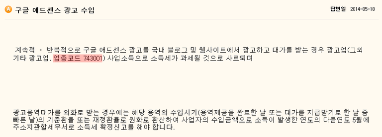 참고로 블로그 또는 웹사이트에서 구글 애드센스 광고를 통해 수입을 얻는 사람은 사업자 등록을 할 때, 업종 코드를 743001로 해서 신청하면 된다고 합니다.